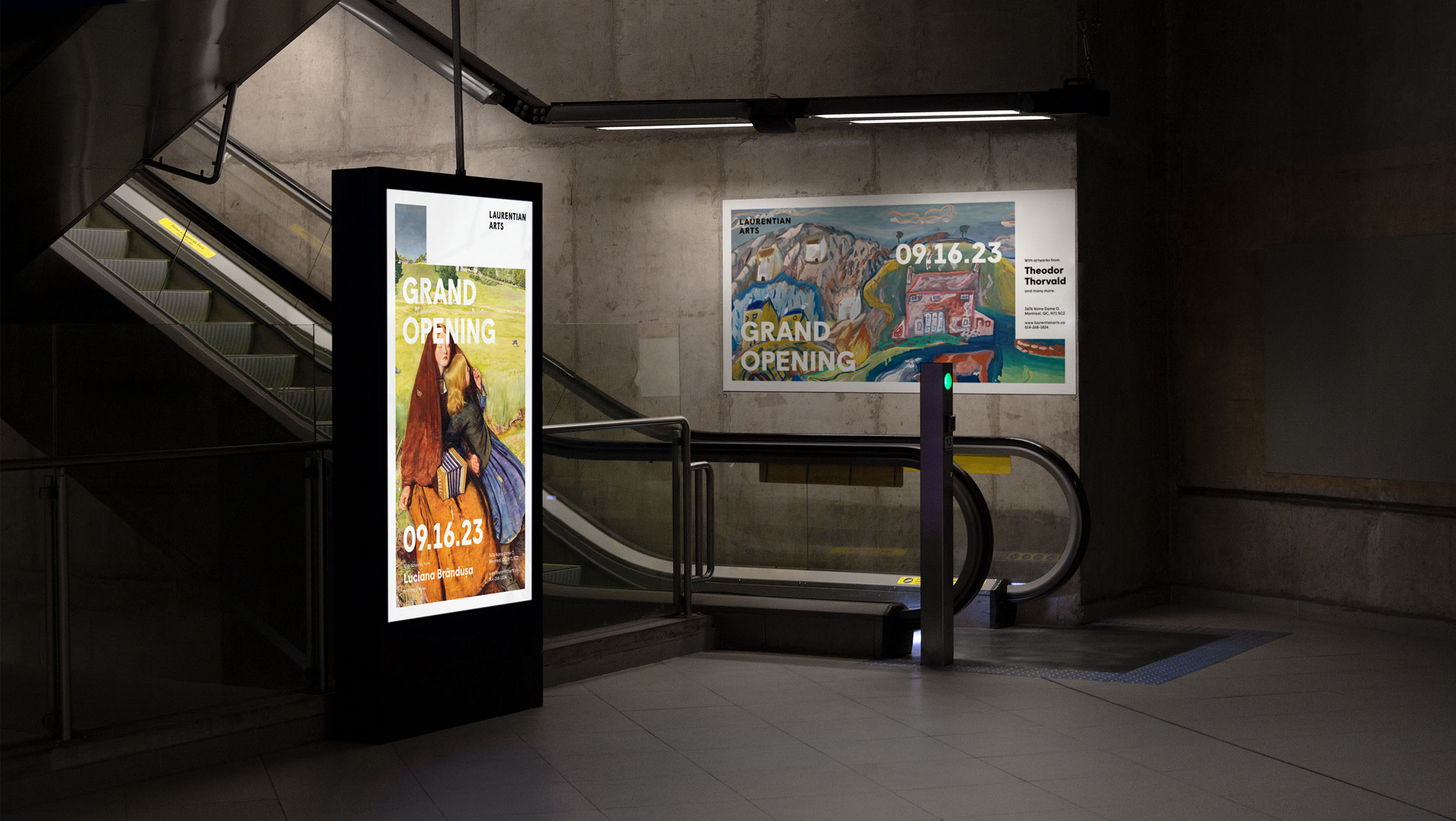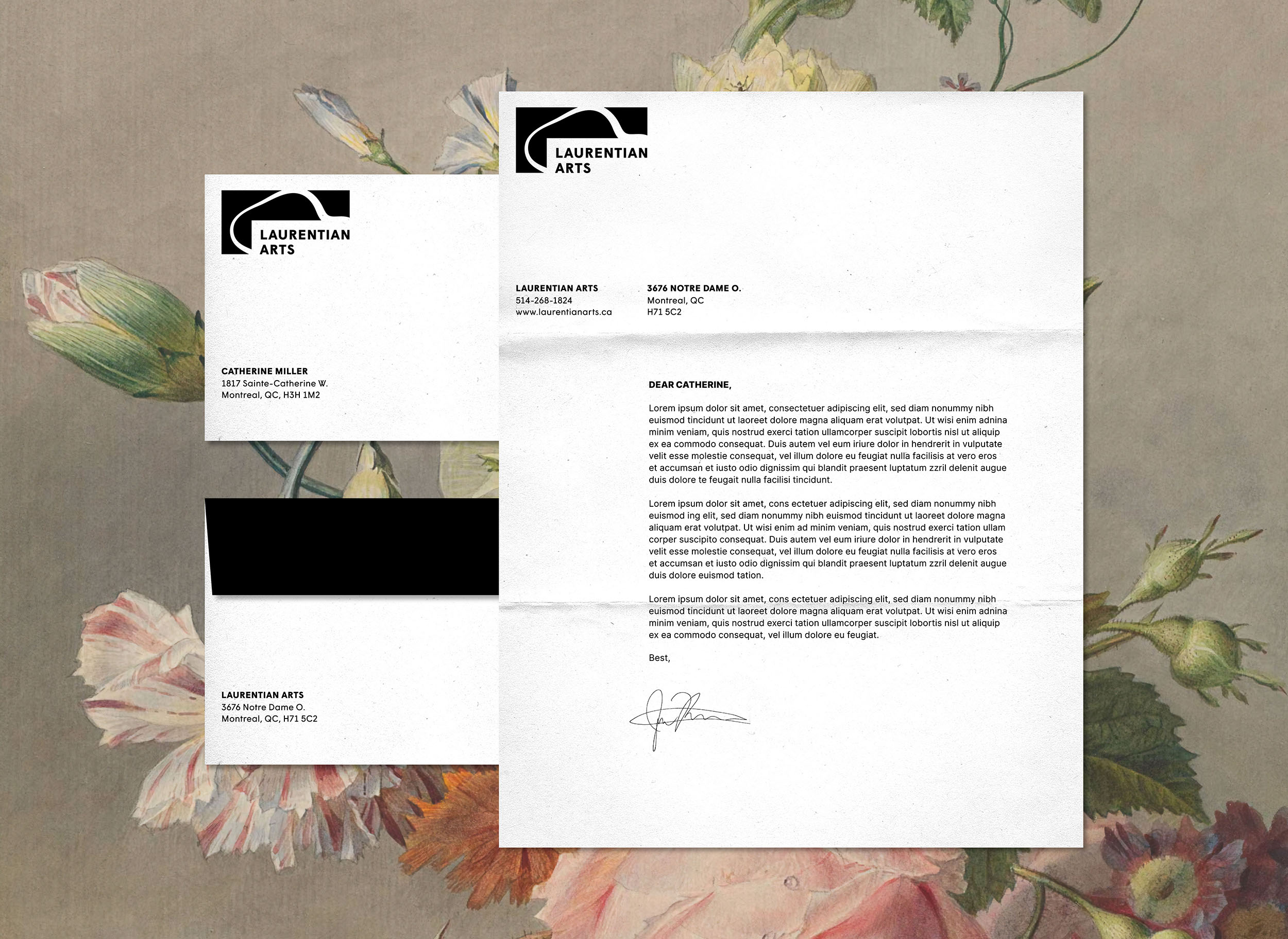 Laurentian Arts is a local art gallery interested in selling paintings that depict nature. The logo represents the relationship between artist (a frame/the letter L) and nature (an organic line that could be interpreted as a mountain range, stream of water, or the rings found on tree trunks).
